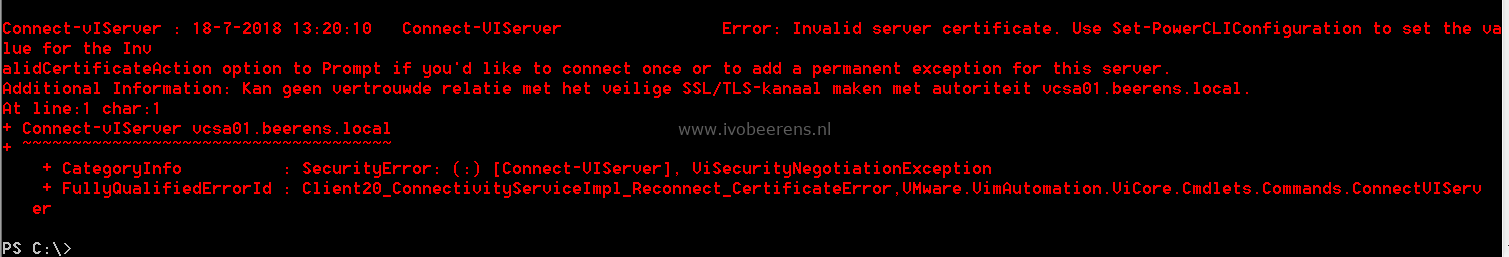 Connect-vIServer : 18-7-2018 13:20:10 Connect-VIServer Error: Invalid server certificate. Use Set-PowerCLIConfiguration to set the value for the InvalidCertificateAction option to Prompt if you’d like to connect once or to add a permanent exception for this server.